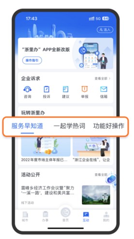 如何更好地發(fā)現并用好辦事服務?“玩轉浙里辦”推出了“服務早知道”“一起學熱詞”“功能好操作”欄目。為了方便法人用戶了解“浙里辦”的服務事項,“服務早知道”提供了“浙里辦”多種服務事項的介紹內容,讓您不僅能辦事,還能辦好事;為了方便法人用戶了解政務服務相關名詞,“一起學熱詞”提供了如“一件事”等專業(yè)名詞的解釋和業(yè)務介紹,還有專業(yè)概念下所包含的服務內容,歡迎您多多查看,了解企業(yè)辦事的深度集成;“功能好操作”,為您介紹“浙里辦”APP上線的諸多新功能!
