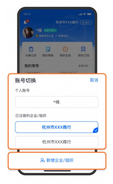 如您還未綁定企業(yè)/組織,點擊“新增企業(yè)/組織”,即可新增法人賬號;如您已綁定企業(yè)/組織,則可直接進行個法賬號切換。需要注意的是,當您切換法人賬號后,“我的”頁面顯示的企業(yè)信息為你當前切換的法人賬號所在企業(yè)/組織信息。