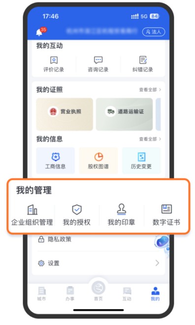 “我的管理”包含了“企業(yè)組織管理”“我的授權”“我的印章”“數字證書”四項功能。