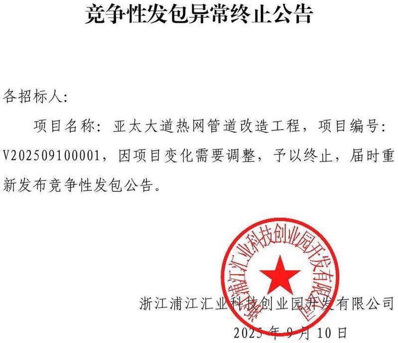 (競爭性發包)亞太大道熱網管道改造工程_異常終止公告